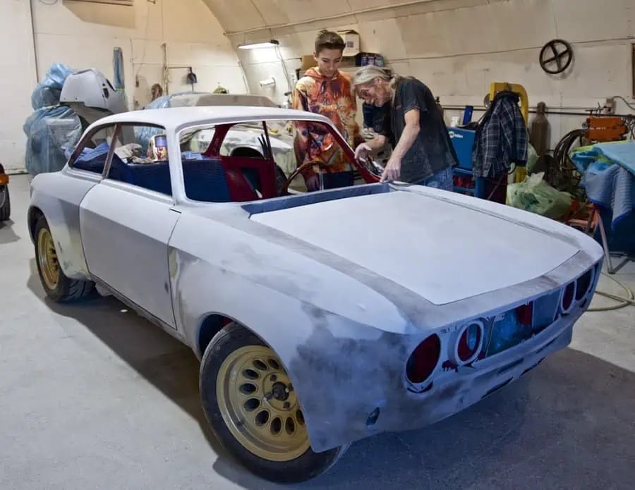 A set of sliding doors opened into the body shop. There was another Jensen here, this one a rare FF1 four-wheel-drive example, having its old paint stripped. Up on a rack sat a 1972 Mercedes Benz 280 SEL sedan undergoing a full restoration. The owner was having the rebuild completed to honour the memory of his father, the car’s original owner. In the centre of the shop sat a highly customized Alfa Romeo GTV, its one-off body created through the artistry of body man Paddy Kilmartin. By using an English Wheel, a tool for shaping and sculpting pieces of sheet metal, Paddy created mirror-image wheel bulges for both sides of the car and had blended them perfectly to the main body. In the engine bay sat the car’s highly tuned four-cylinder power plant that produces over 290 horsepower.